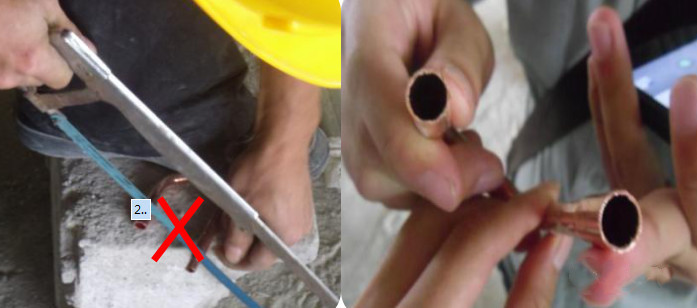 铜管切割:铜管配管中难免有过长或者拼接情况,铜管过长需割断,为了保证断面平整方便拼接焊接或者扩口等操作,必须使用割管刀,避免使用除割管刀以外的任何工具进行对铜管的切割工作,否则的话使用其他工具导致的不平整断面会影响以后的焊接、扩口等操作质量,直接影响到系统气密性。