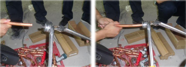 胀管:同管径铜管拼接时,为了保证焊接质量需要对一端铜管进行扩杯型口或者采用直通连接,而扩杯型口需要使用胀管器。不可扩喇叭口连接,更不可用尖嘴钳扩口直接进行焊接,否则会导致焊接质量下降,极有可能泄漏冷媒。